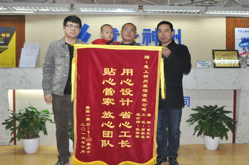 付出的汗水和收獲的耕耘永遠是成正比的,粟女士被設計師和工人的辛勤努力深深地打動的,提議來公司送來一面錦旗,能得到客戶的認可和嘉獎,我們深感欣慰與喜悅,我們一定會矢志不渝的提高服務質量和裝修水準,您的一份信任,還您整個家園。